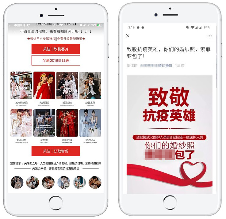 索菲亞婚紗攝影借助朋友圈廣告拉新獲客,通過公眾號關(guān)注進行流量沉淀,再用內(nèi)容種草實現(xiàn)客戶的轉(zhuǎn)化與留存。尤其是在本次疫情期間,索菲亞婚紗攝影公眾號推出“致敬抗疫英雄”的主題活動,為合肥當?shù)氐目挂吖ぷ髡咚腿ジ@鹱x者的情感共鳴,促進了客戶的留存、轉(zhuǎn)化。