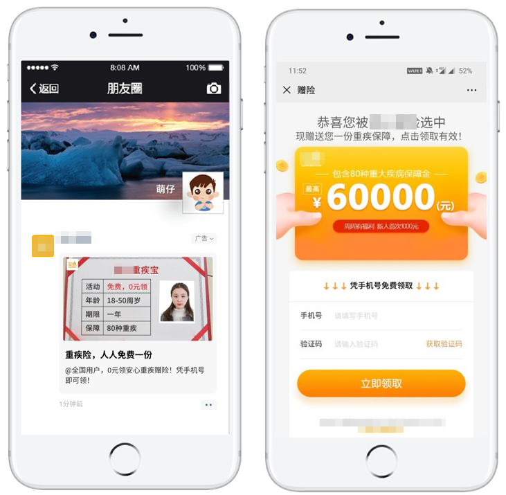 點擊外層卡片進入落地頁,優(yōu)化師將價值60000元重疾保險金設(shè)置成卡券樣式,營造了一種保額可觀、機會難得的氛圍;輸入手機號即可免費領(lǐng)取,有效吸引客戶留資,為后續(xù)的投保和續(xù)保打好堅實基礎(chǔ)。