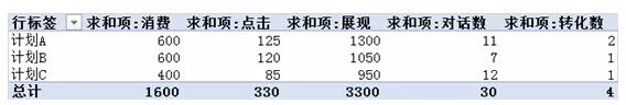 所以我們可以直接使用整理好的關(guān)鍵詞報(bào)表,將其制作成數(shù)據(jù)透視表,以方便查看各個(gè)計(jì)劃的投放效果。